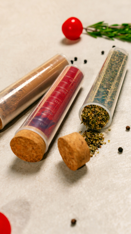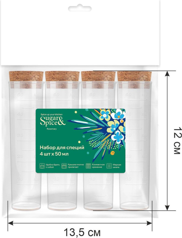 Набор для специй Sugar&Spice Rosemary из 4 стеклянных колб с натуральными пробковыми крышками. Стильное и практичное решение для хранения соли, перца и ароматных приправ.