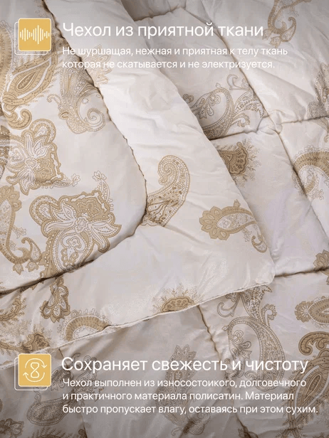 Чехол одеяла "Лебединая нежность" простеган многоигольной машиной, что в совокупности с технологией термоскрепления позволяет достичь повышения износостойкости одеяла. Наполнитель не скатывается и не сваливается, позволяя прочно сидеть в чехле, при любых нагрузках (стирка, сгибание и др.) изделие не меняет своих первоначальных свойств. Наполнитель искусственный,лебяжьего пуха, сочетающий в себе плюсы натурального пуха, обладающий своими исключительными особенностями.