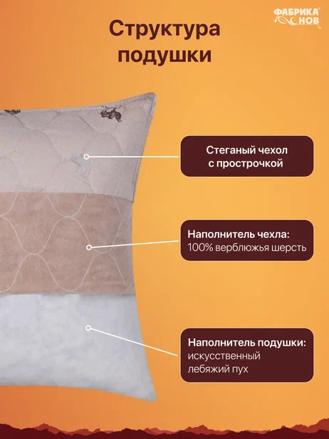 - натуральная верблюжья шерсть в стежке чехла подушки- согревает зимой и дарит комфортную температуру летом, а также обладает целебными свойствами;