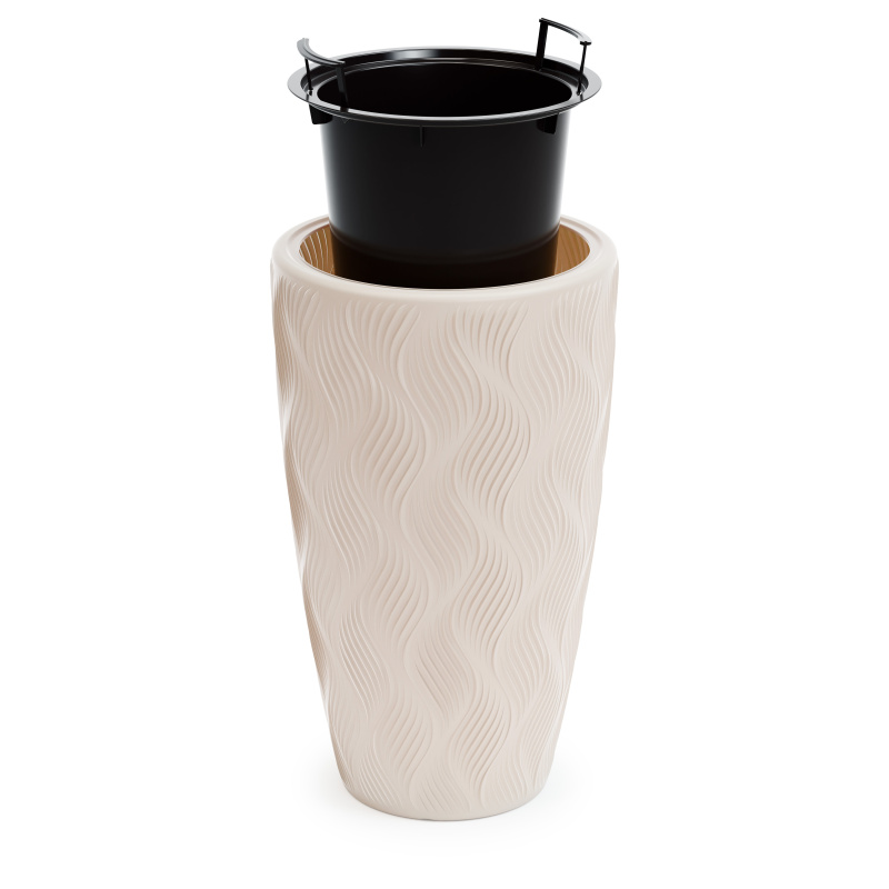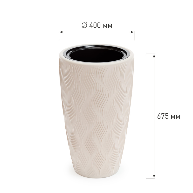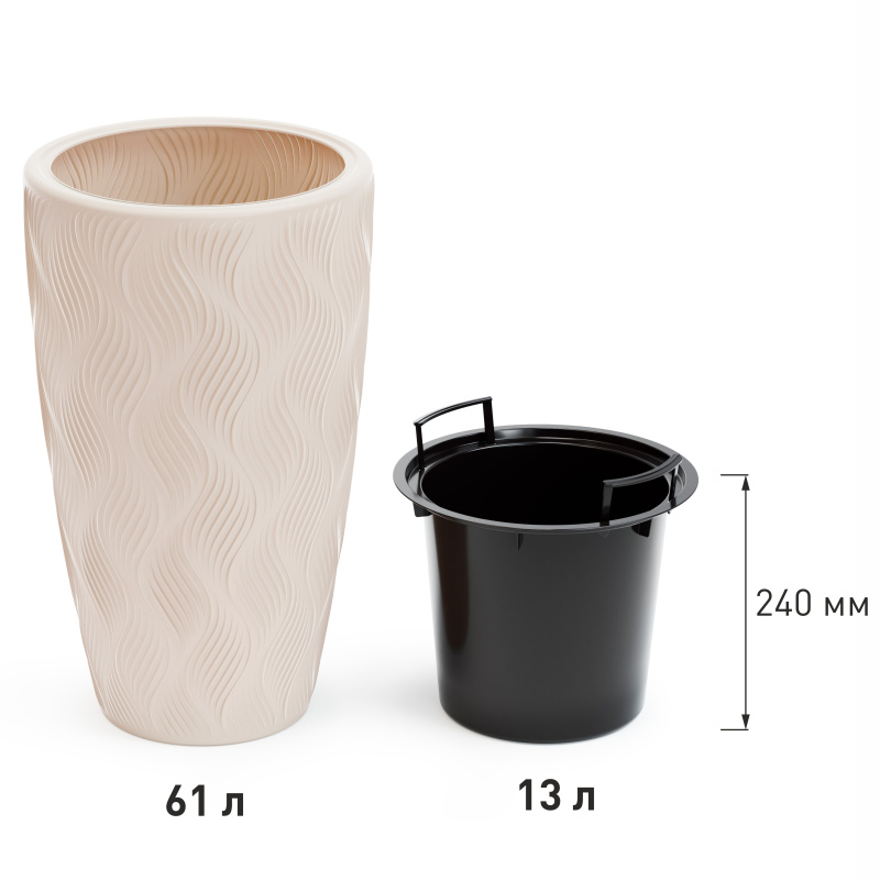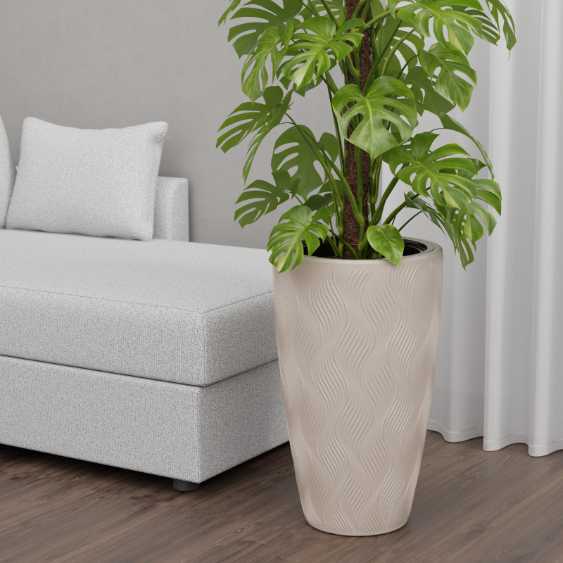 Кашпо «Флэйм» объёмом 61 литр — элегантное высокое кашпо со вставкой на 13 литров, которое идеально подходит для крупных растений и интерьерных композиций. Лёгкое, прочное и устойчивое, оно украшено стильным рельефным узором, создающим эффект дорогостоящей фактуры. Отлично вписывается в современные интерьеры, холлы, офисы и террасы.